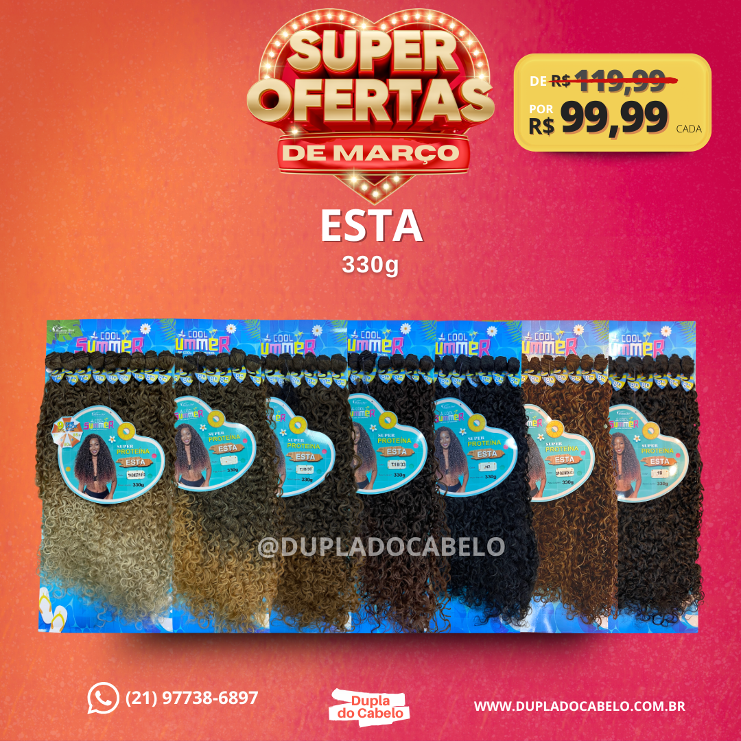 O Cabelo Esta - Modern Girl tem cachos definidos e longo comprimento. Compõe a coleção Cool Summer, ele é de fibra de Super Proteína que adere creme, permite ser penteada e suporta calor, fibra desenvolvida para praia e piscina. Cada pacote contém 9 peças que variam entre 75 cm/80 cm/85 cm e totalizam em 330 gramas.