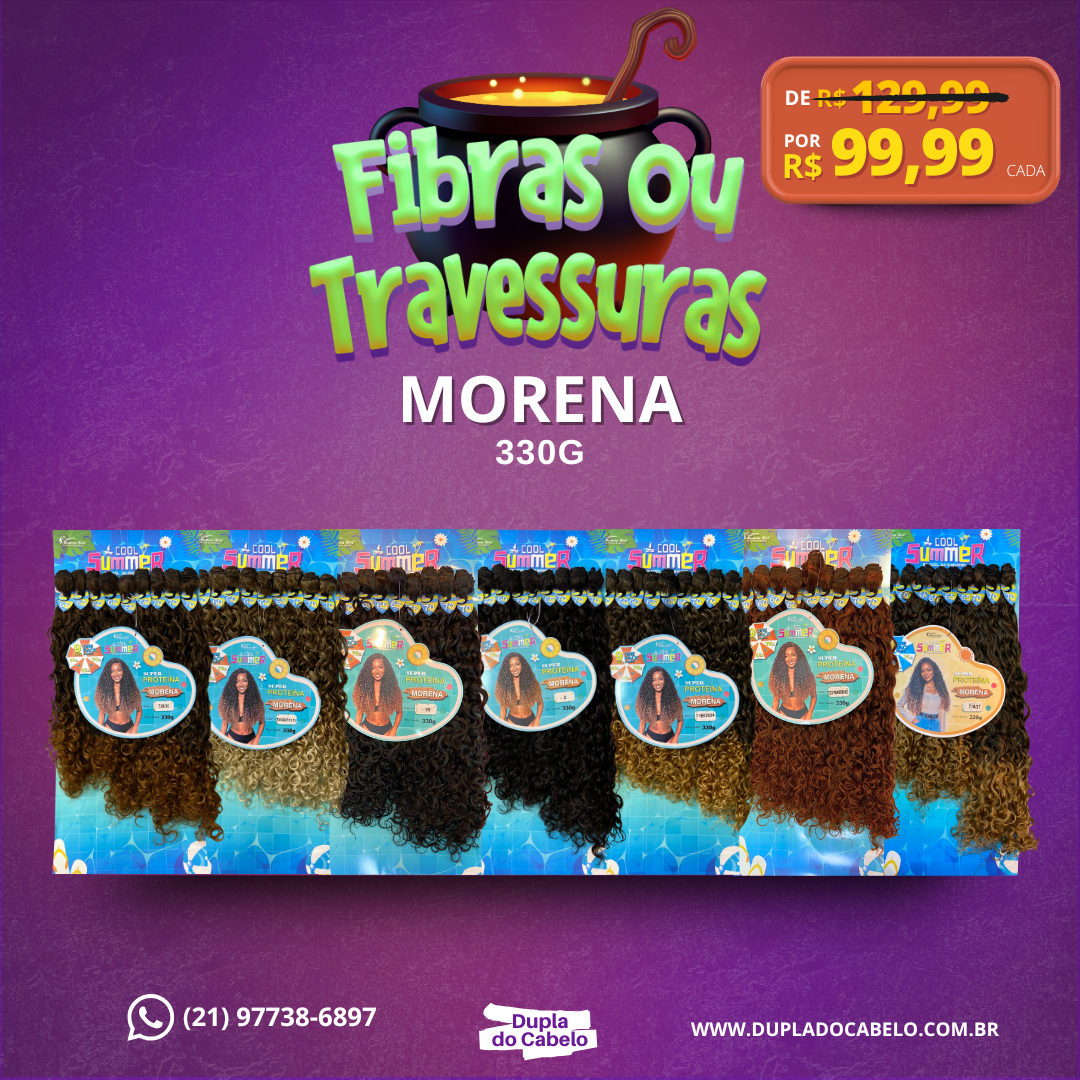 O Cabelo Morena - Modern Girl tem cachos abertos e longo comprimento. Compõe a coleção Cool Summer, ele é de Biofibra que adere creme, permite ser penteada e suporta calor, fibra desenvolvida para praia e piscina. Cada pacote contém 9 peças que variam entre 60cm/65cm/70cm e totalizam em 330 gramas.
