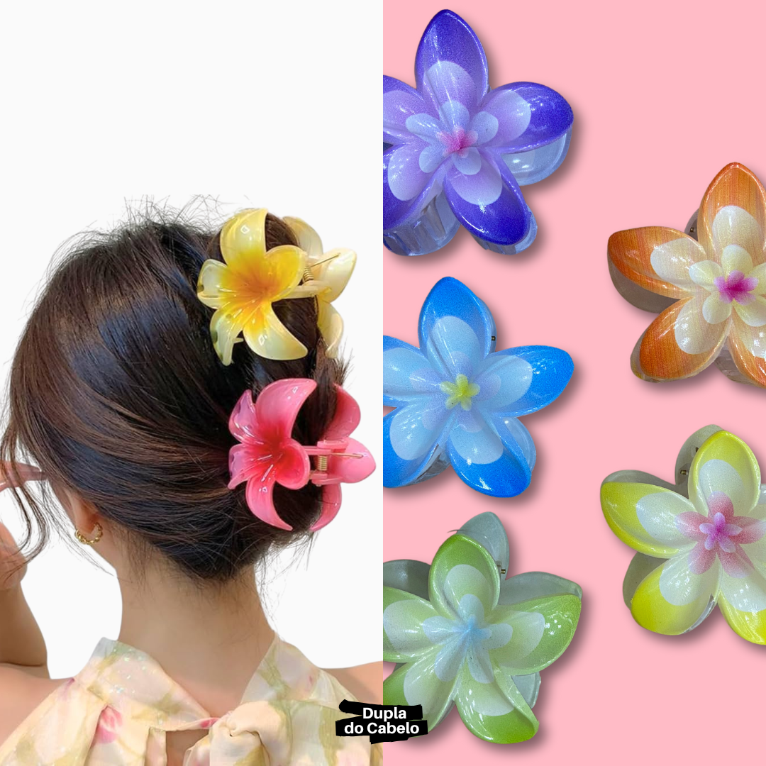Material Durável e Especial: Fabricada com plástico resistente e exclusivo, a presilha é adornada com clipes de garra e encantadoras flores havaianas, proporcionando um visual único e elegante.